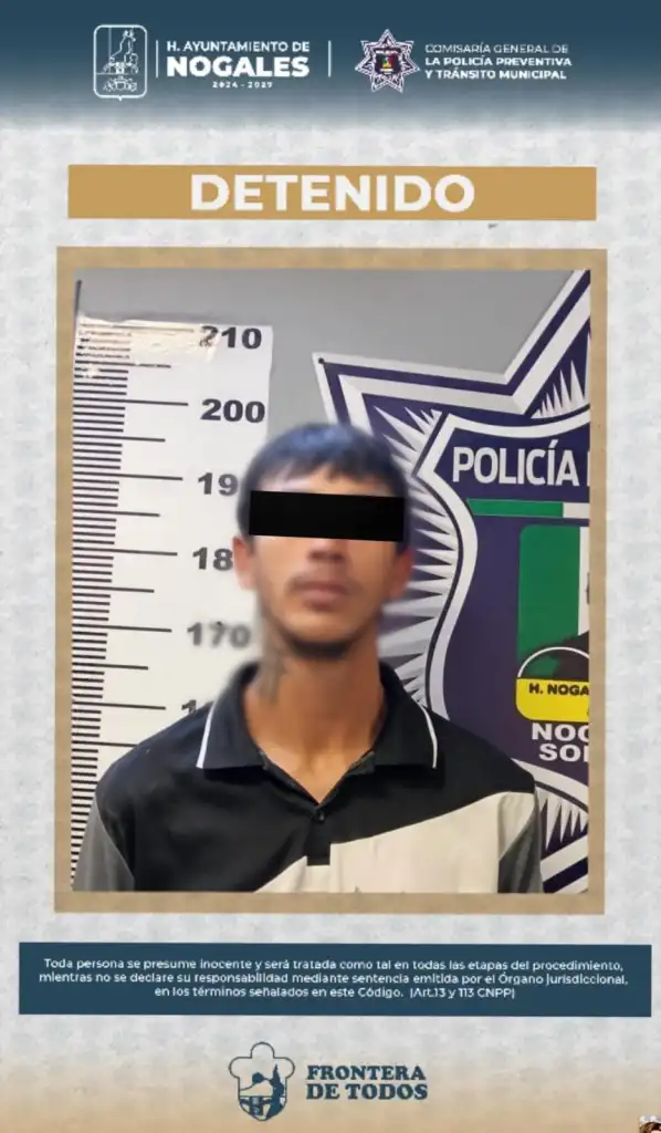 Nogales, Sonora.- Elementos de la Policía Municipal detuvieron a un joven de 21 años señalado por agredir físicamente a su hermana y amenazar verbalmente a su padre, en hechos ocurridos la tarde del domingo en la colonia Altamira.